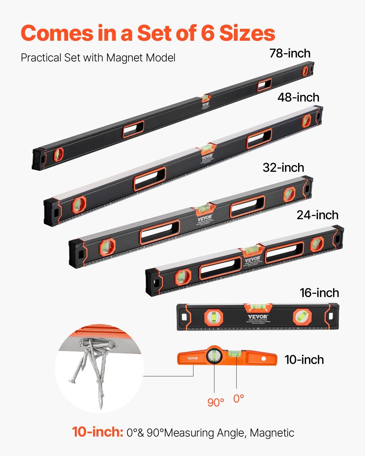 Home > VEVOR 6-Piece Torpedo Level, 78/48/32/24/16/10 Inch Box Levels Set, Bubble Vials Ruler for 45/90/180 Degree