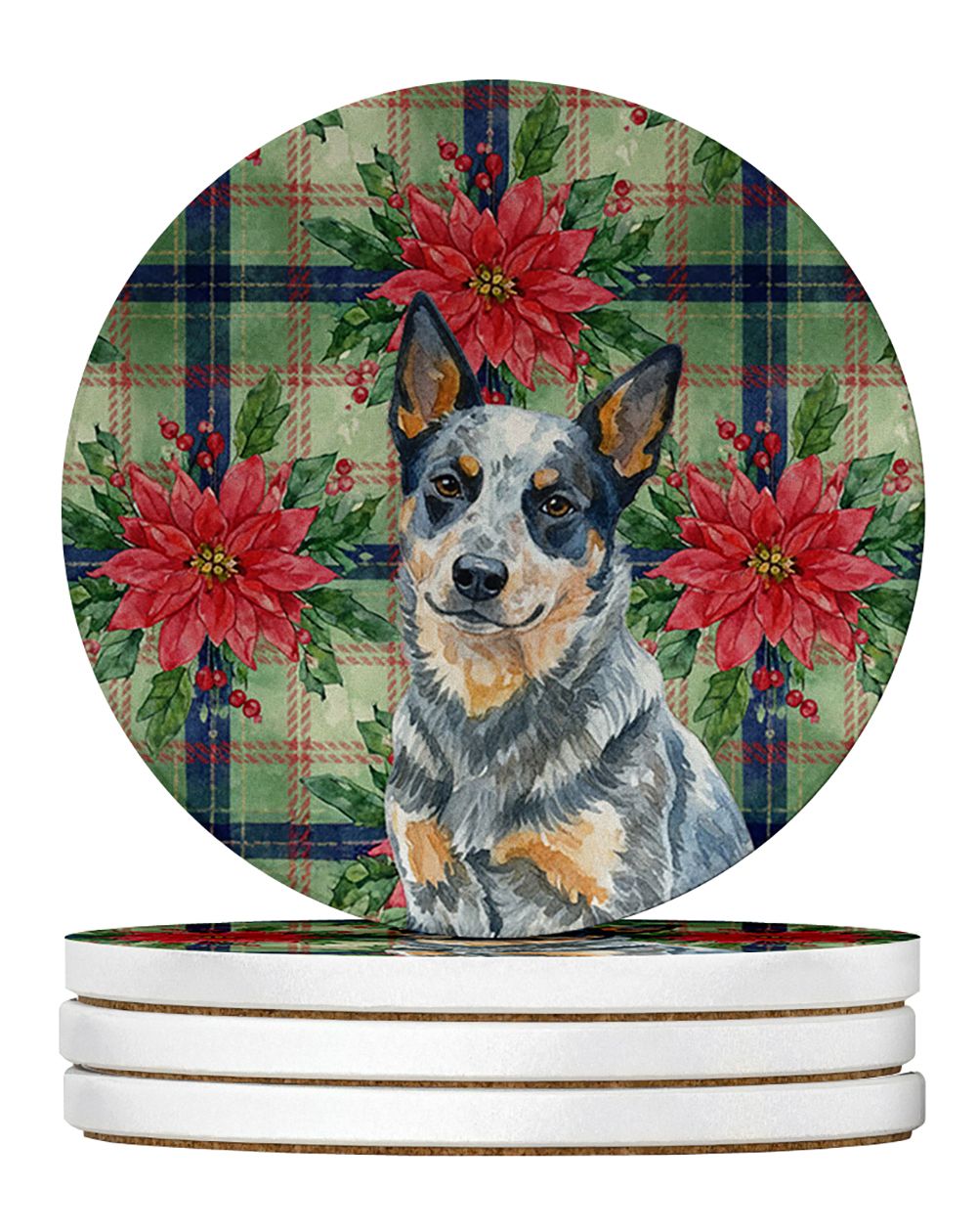 Home > Blue Heeler Australian Cattle Dog Christmas PoinsettIas Large Sandstone Coasters Pack of 4 Absorbent Round Coasters Decor Gifts for Men or Women, 4 in
